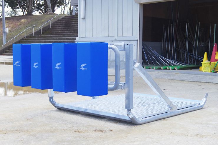 ウォータータンクを置いたり、人を乗せたりすることによって負荷を変えられる、ジュニア世代からトップ世代まであらゆるレベルに合わせて調整できるスクラムマシンです。